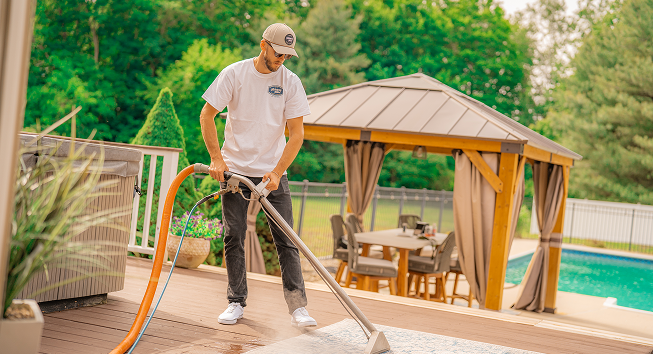 Steam cleaning uses high-temperature vapor to break down and lift grime, algae, and mildew without the need for harsh chemicals or damaging pressure. Unlike traditional pressure washing, our steam method is gentle on your surfaces while still delivering deep, lasting results.